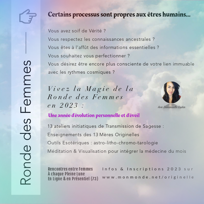 La Ronde des Femmes est un cercle de femmes basé sur la transmission d'enseignements des 13 Mères Originelles et d’outils ésotériques. Un rendez-vous mensuel à chaque Pleine Lune et tout au long de l’année, à la rencontre de la sagesse féminine ancestrale et actuelle.